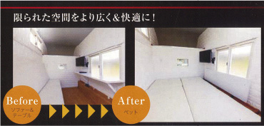 トリパルは限られた空間でより広く快適に過ごすために、組み立て式ソファベッドと可倒式テーブルを備え付けています。作業部屋として使う事も寝室のようにゆっくりと過ごす事も出来ます。